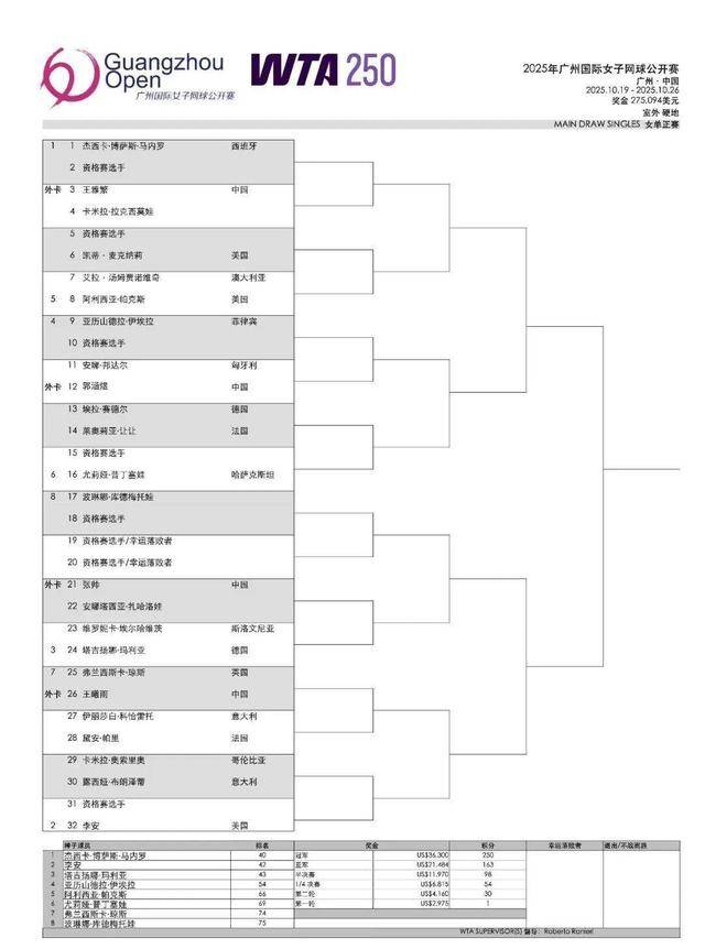 2025美网公开赛投注,美网盘口赔率,美网冠军预测,美网投注网站,美网网球赛直播/2025美国网球公开赛全面开盘,提供最新美网盘口赔率、赛程赛果、冠军预测及权威分析,助力网球迷与玩家安全、快捷地参与美网投注。10月19日,2025年广州国际女子网球公开赛女子单打签表出炉,张帅领衔王曦雨、王雅繁和郭涵煜等“金花”出战,玛利亚、普汀塞娃、伊埃拉、汤姆贾诺维奇和帕克斯等名将参赛。10月20日,单双打正赛在广州南沙国际网球中心开幕。