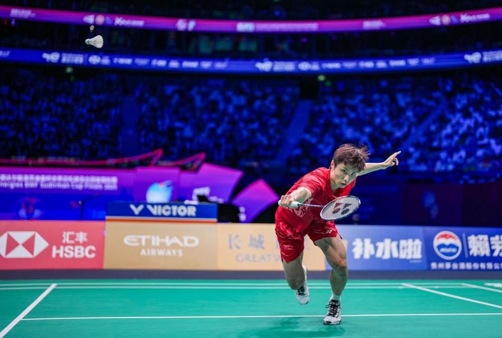 ↑5月4日,中国队选手石宇奇在2025年苏迪曼杯世界羽毛球混合团体锦标赛决赛男单比赛中回球。最终,他2比0战胜韩国队选手全奕陈。