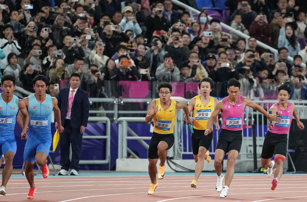 ↑11月20日,广东队选手苏炳添(右一)与队友刘洪熙在第十五届全国运动会田径项目男子4X100米接力决赛中交接棒。