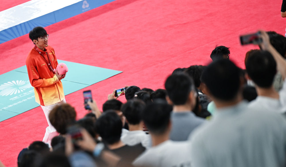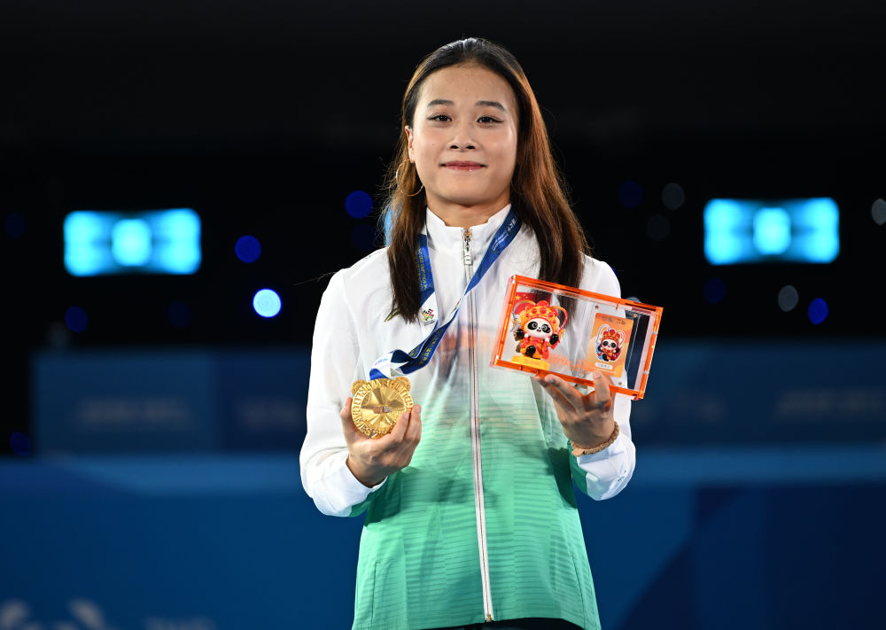 ↑8月17日,冠军中国选手郭朴在2025年成都世运会女子单人霹雳舞颁奖仪式上。