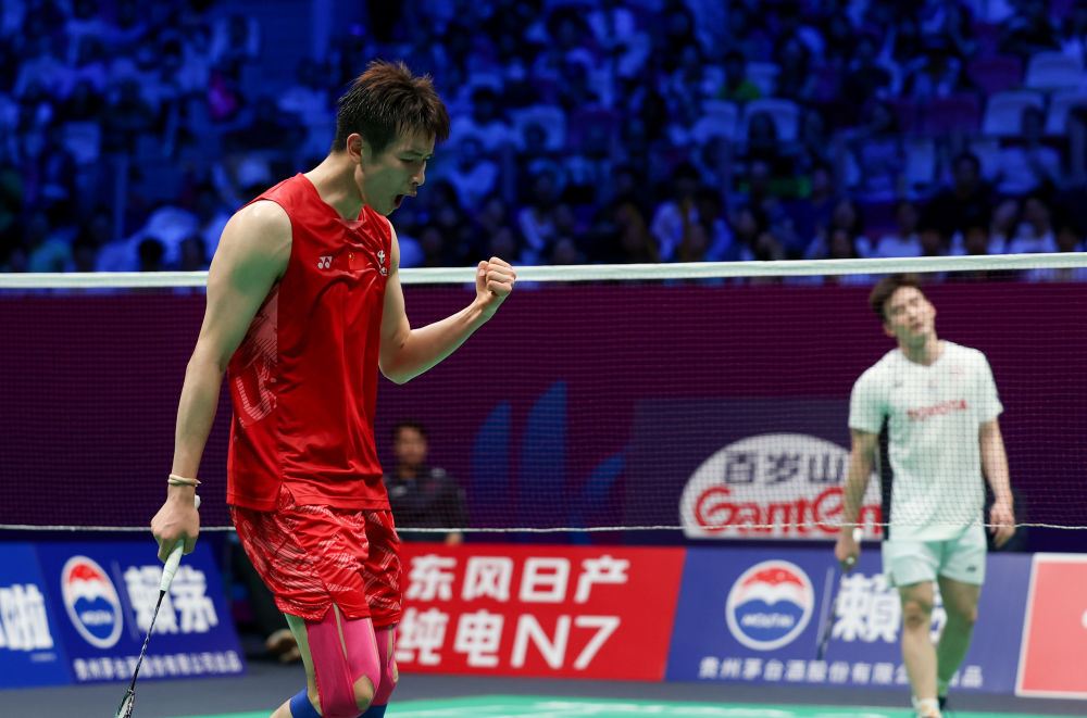 ↑4月30日,中国队选手李诗沣(左)在男单比赛中庆祝得分。最终,他2比1战胜泰国队选手王高伦。
