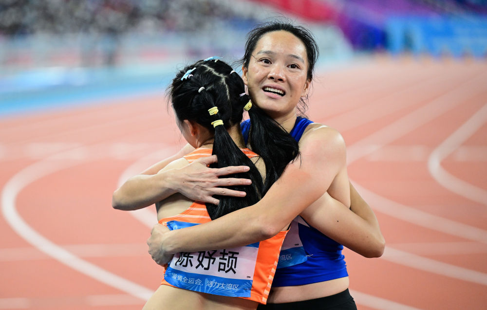 ↑11月17日,浙江队选手陈妤颉(左)和广西队选手韦永丽在第十五届全国运动会田径女子100米决赛后拥抱。她们分获冠军和亚军。