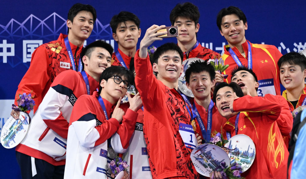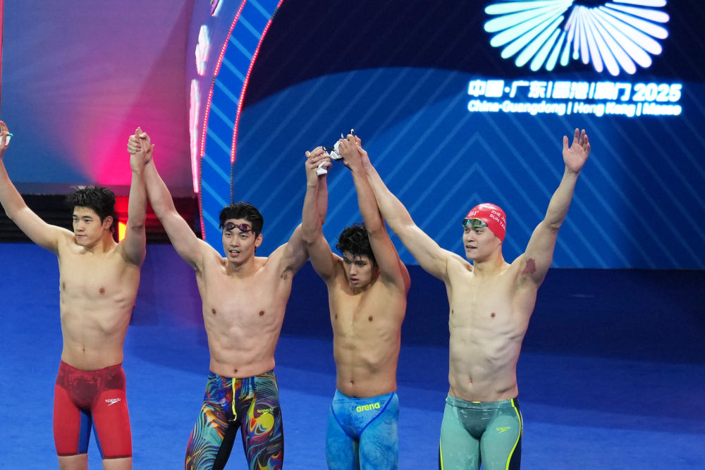 ↑5月22日,浙江寿仙谷队选手孙杨(中)在2025年全国游泳冠军赛男子4x200米自由泳接力颁奖仪式上与获奖运动员合影。