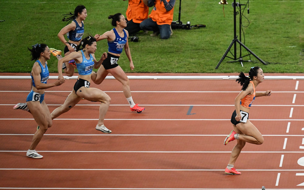 ↑11月17日,浙江队选手陈妤颉(右)在第十五届全国运动会田径女子100米决赛中率先冲线。