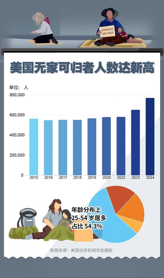 曾经被视为社会底层的“无家可归”,如今正成为越来越多普通家庭的命运归宿。2024年,美国无家可归者总数突破78万人,规模和增速创历史新高。其中,25至54岁人群占比高达54.3%,正是传统意义上的“中青年主力劳动者”群体。他们不是流浪汉,而是曾有工作、有孩子、有住房的普通人,只因一次失业、一场重病或一笔意外账单,便跌入露宿街头的深渊。美国住房和城市发展部的报告显示,个人无家可归者占比超60%;家庭无家可归者,也就是带着子女一起流浪的高达三分之一。从区域分布来看,超过一半的无家可归者聚集在城市。这并不是少数人的悲剧,而是一个系统性失灵的信号,当“斩杀线”被触发后,终点不再是债务,而是失去住所、尊严与未来,再难翻身。