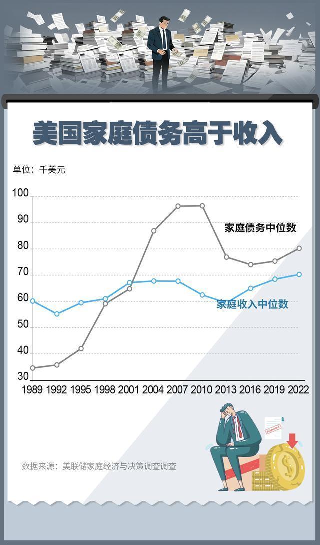 美国家庭收入正在增长,但“斩杀线年以来,家庭收入中位数仅从约6万美元微增至2022年的7万美元,而家庭债务中位数却从3.5万美元飙升至8万美元以上,翻了一倍多。尤其在次贷危机前后,债务激增远超收入增长,即便近年收入略有回升,债务负担仍高居不下。越来越多家庭看似“有收入”,实则深陷债务泥潭,一旦收入中断,立刻面临违约、信用崩坏甚至资产被没收的风险。